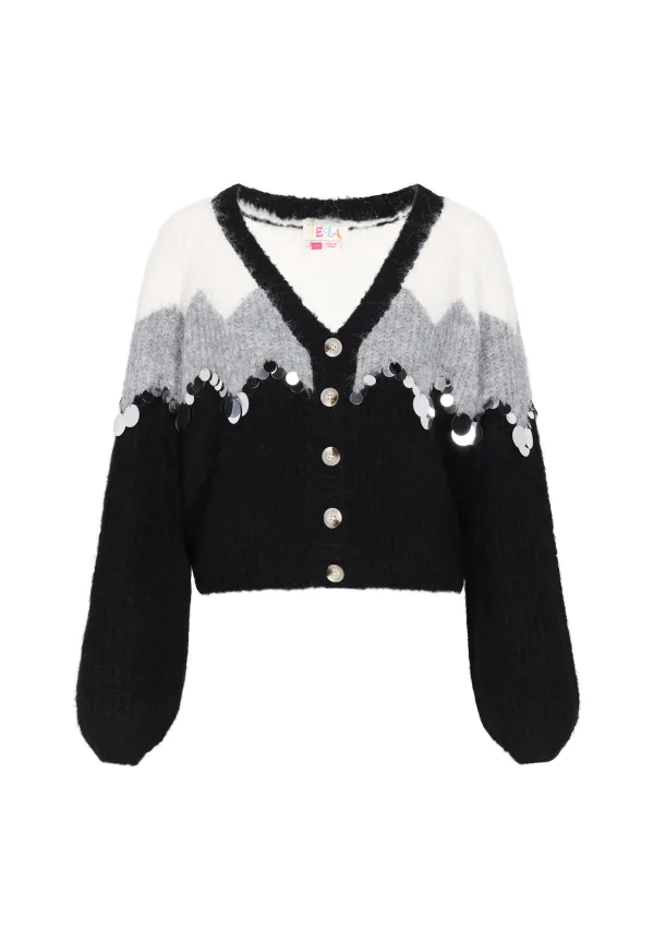 Design: Rechte zoom, Knop placket, Geribd ceintuurtje; Type sluiting: Knoopsluiting; Materiaal: Knitwear; Halstype: V-hals; Motief: Color-Blocking; Details: Pailletten; Extra's: Glitterend, All-over patroon, Op staal naden; Pasvorm: Wijde pasvorm; Armlengte: Lange mouw; Lengte: Normale lengte