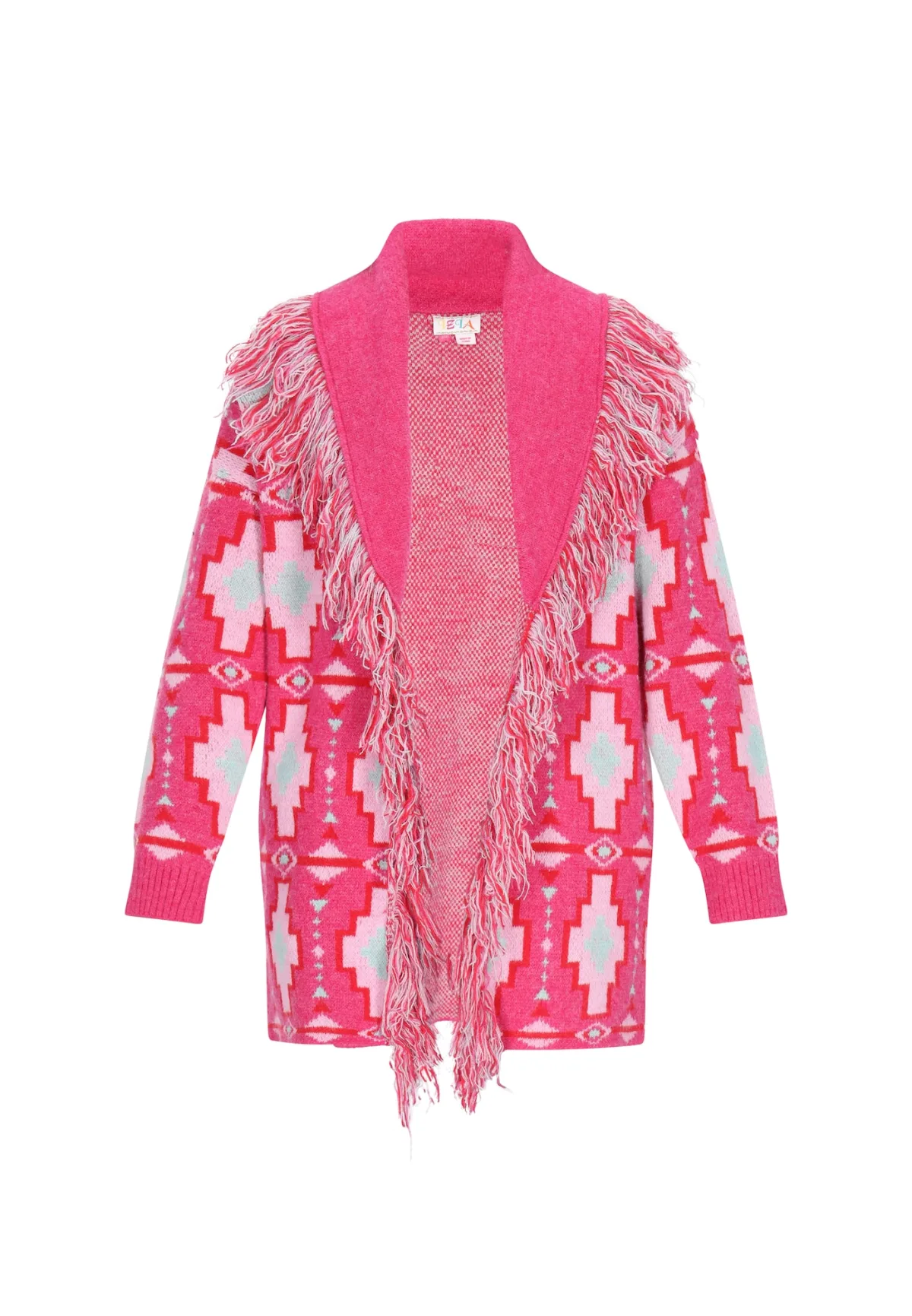 Design: Geribd ceintuurtje, Zakken aan de zijkant; Type sluiting: Open; Materiaal: Knitwear; Motief: Aztec print; Details: Franjes; Extra's: Voelt zacht aan; Pasvorm: Normale pasvorm; Armlengte: Lange mouw; Lengte: Normale lengte