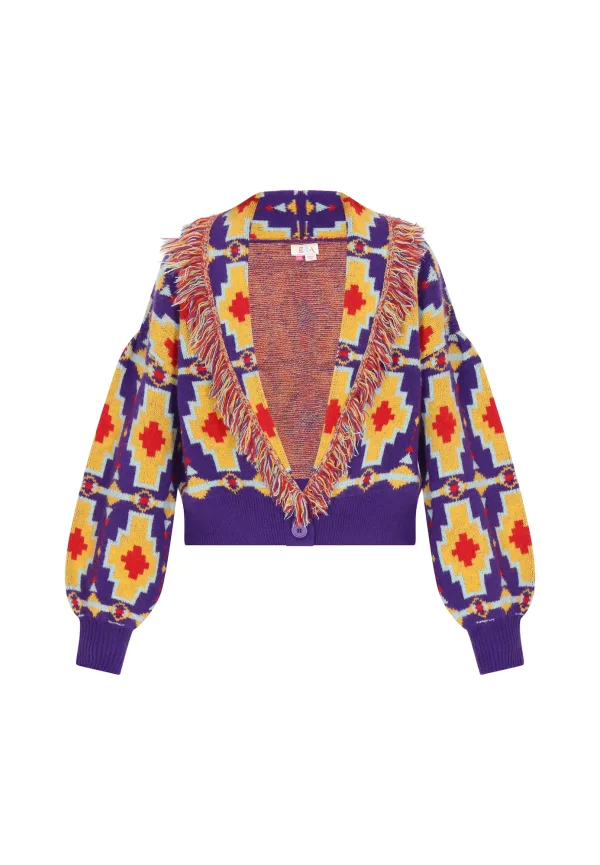 Design: Geribbelde kraag, Geribd ceintuurtje; Type sluiting: Knoopsluiting; Materiaal: Knitwear; Details: Franjes; Extra's: All-over patroon, Voelt zacht aan; Pasvorm: Normale pasvorm; Armlengte: Lange mouw; Lengte: Normale lengte