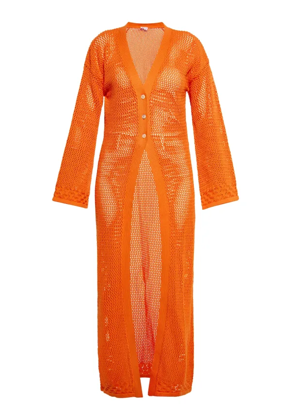 Dit voortreffelijke vest met lange mouwen heeft een gebreide textuur die over het hele oppervlak een ingewikkeld, opengewerkt patroon creëert. Met een flatterende V-hals en een knoopsluiting aan de voorkant die in het midden loopt. Rechte mouwen, versierd met een delicaat gekarteld breipatroon aan de onderkant, geven dit zomermodel elegantie. Dit vest is perfect om over elke outfit te dragen en is subtiel transparant voor een luchtige look. Vest