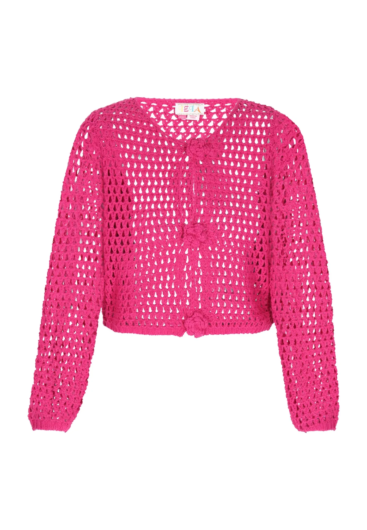 Design: Geribd ceintuurtje; Type sluiting: Knoopsluiting; Materiaal: Knitwear; Halstype: Ronde hals; Motief: Effen; Details: Mesh; Extra's: Fully fashioned; Pasvorm: Normale pasvorm; Armlengte: Lange mouw; Lengte: Normale lengte