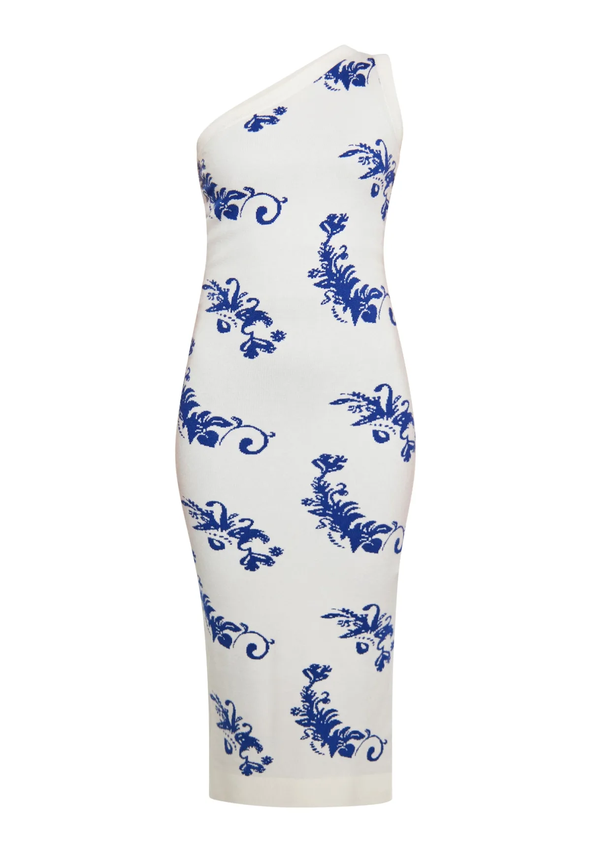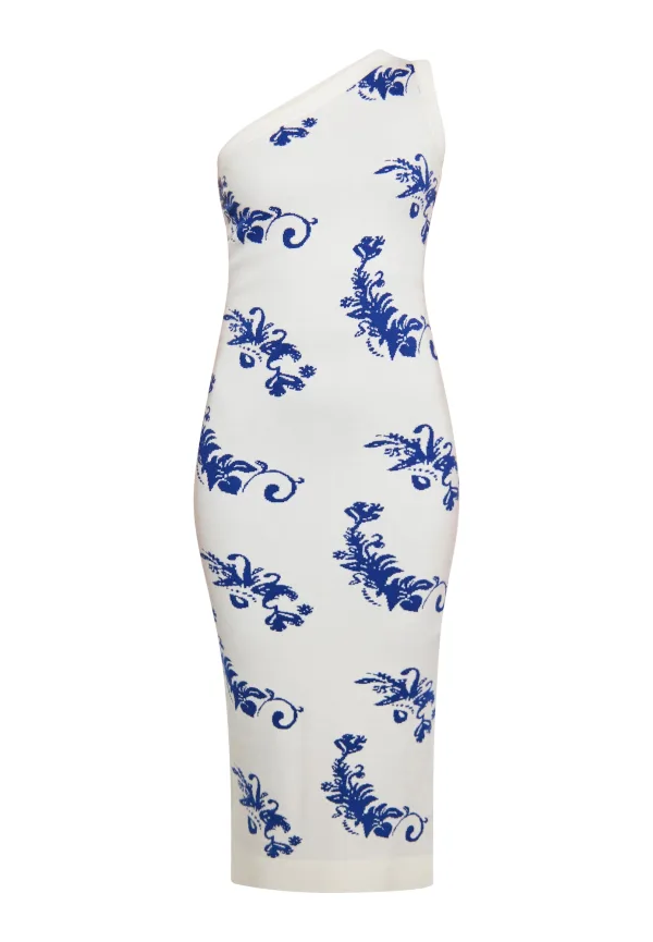 Design: Geribbelde kraag, Rechte zoom; Materiaal: Knitwear; Soort bandjes: One-shoulder; Extra's: All-over patroon, Fully fashioned; Lengte: Knielengte; Snit: Getailleerd; Pasvorm: Slanke pasvorm; Armlengte: Mouwloos