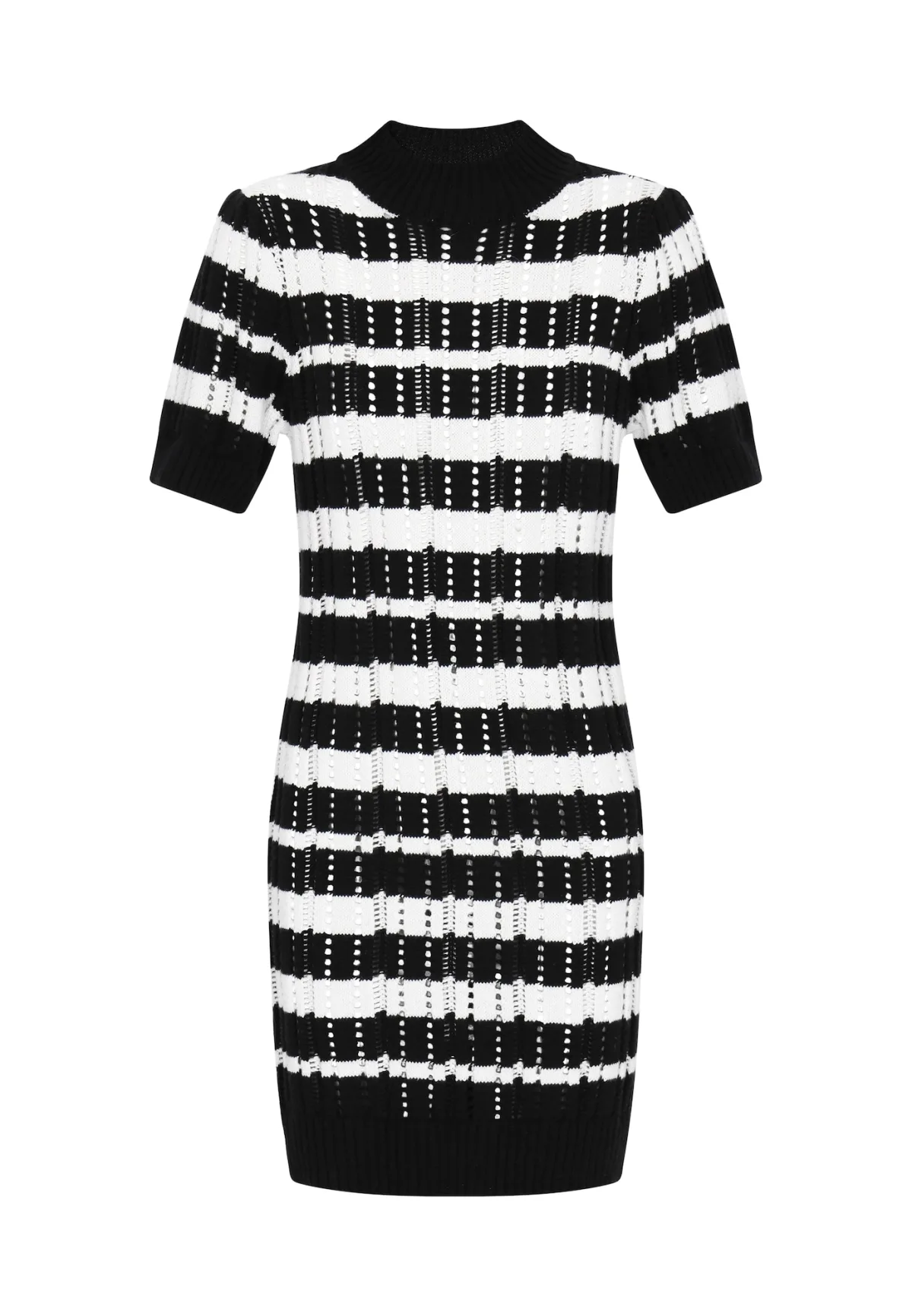 Design: Geribbelde kraag; Type sluiting: Slip; Materiaal: Knitwear; Halstype: Opstaande kraag; Motief: Gestreept; Details: Mesh; Extra's: Fully fashioned; Lengte: Kort/mini; Pasvorm: Normale pasvorm; Armlengte: Kwartmouw