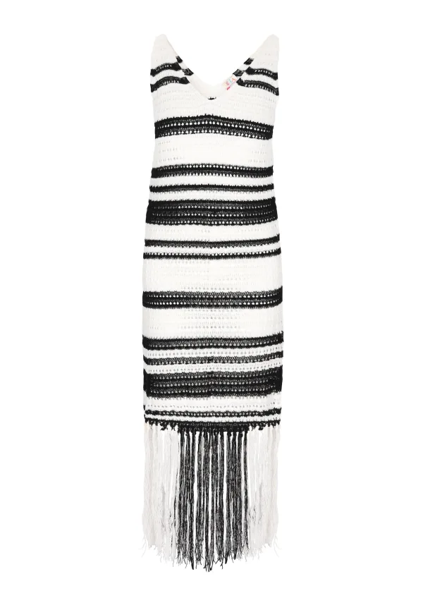 Design: Gefranjerde zoom; Materiaal: Knitwear; Halstype: V-hals; Motief: Gestreept; Soort bandjes: Normale bandjes; Details: Franjes, Mesh; Extra's: Fully fashioned; Lengte: Knielengte; Snit: Recht; Pasvorm: Normale pasvorm; Armlengte: Mouwloos