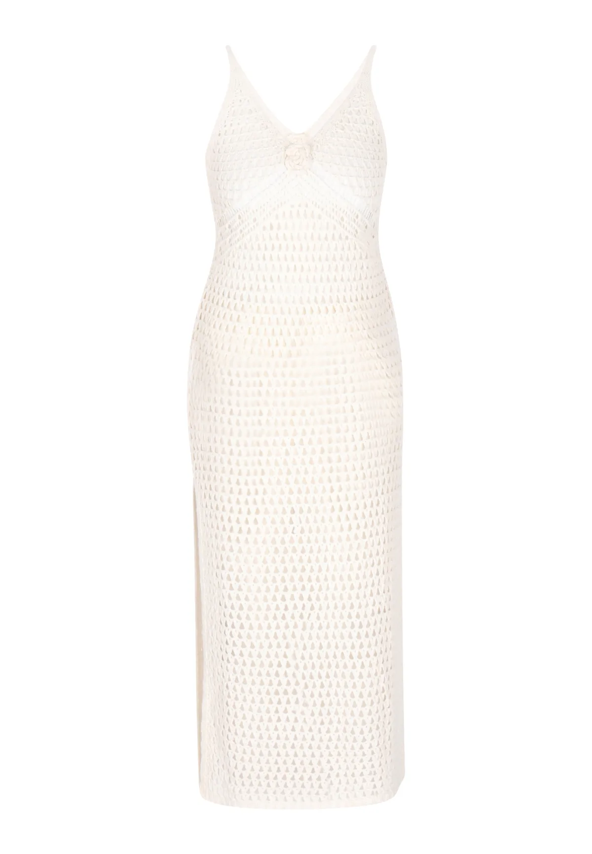 Design: Beenopening; Materiaal: Gehaakt; Halstype: V-hals; Motief: Effen; Soort bandjes: Spaghettibandjes; Details: Mesh; Extra's: Fully fashioned; Lengte: 7/8 lengte; Snit: Getailleerd; Pasvorm: Slanke pasvorm; Armlengte: Mouwloos