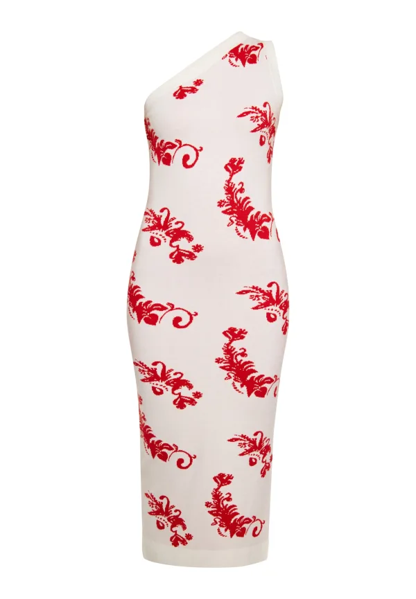 Deze jurk met één schouder is vervaardigd met een jacquardpatroon en straalt elegantie uit. De asymmetrische halslijn geeft een modern tintje aan het aansluitende silhouet, afgestemd om je rondingen te accentueren. Deze midi-jurk is perfect voor speciale gelegenheden en heeft ingewikkelde gebreide bloemendetails, waardoor het een verfijnde keuze is voor wie op zoek is naar een verfijnde look. Jurk