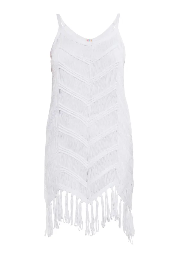 Deze gehaakte mini-jurk met franjes straalt een bohemien charme uit, perfect voor zomerse dagen. Het structuurpatroon heeft geribbelde effecten, terwijl de middelbrede schouderbandjes en de ronde halslijn bijdragen aan de casual uitstraling. De franjedetails aan de onderkant geven het een dynamisch tintje, waardoor het een ideale keuze is voor strandkleding en relaxte uitjes. Jurk