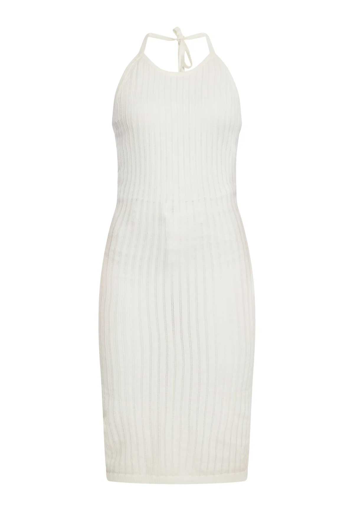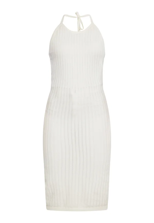 Met deze gebreide midi-jurk krijg je een echte zomerlook. Deze jurk heeft een halfronde halslijn met een strikband in de nek, en het ontwerp met open achterkant voegt charme toe. De geribbelde textuur en het nauwsluitende silhouet maken hem perfect voor zomerse gelegenheden. De mouwloze jurk is verkrijgbaar in een effen versie en een versie met een patroon. Jurk