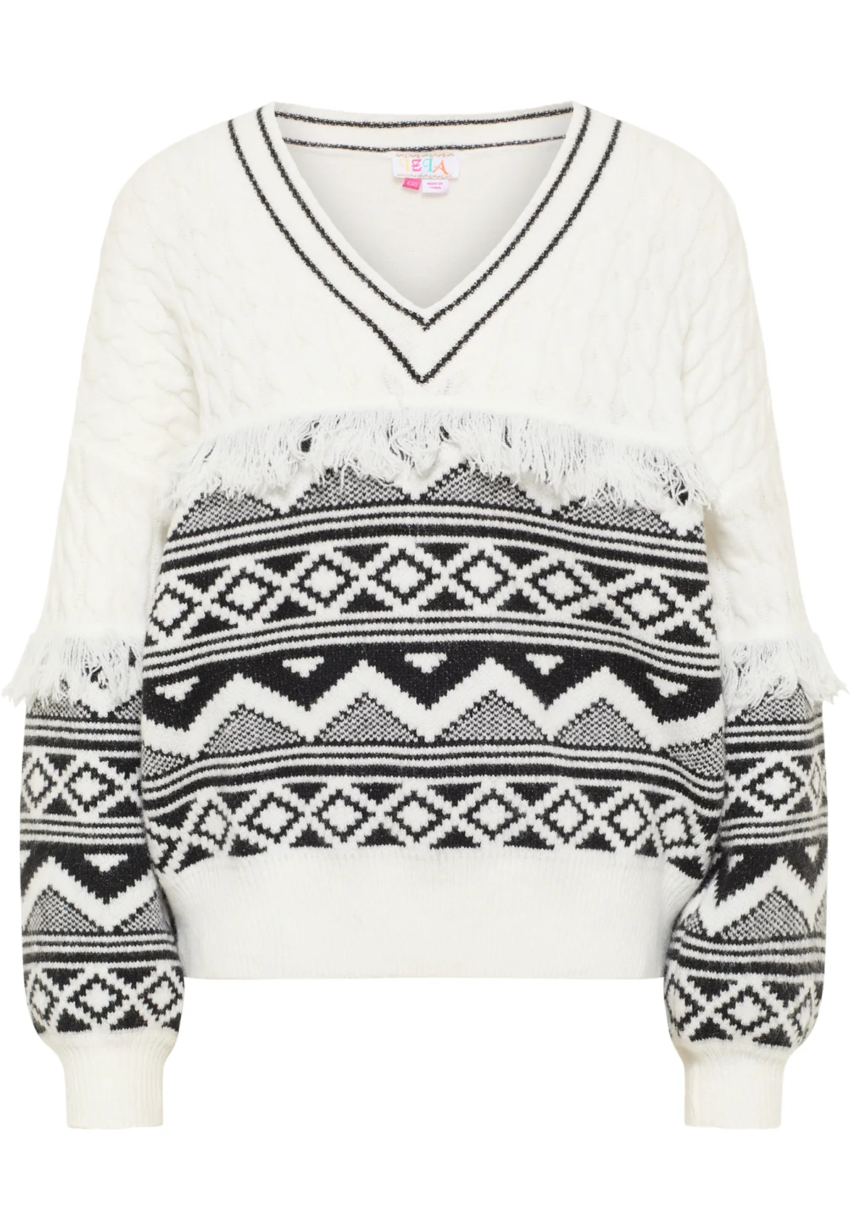 Deze ruimvallende trui van IZIA is gemaakt van een zachte garenmix die zijn vorm behoudt. De sportieve V-hals en het aansluitende kabelbreipatroon zorgen voor een spannende mix, vooral in combinatie met het etnische patroon en de franjes. Maak uw outfit compleet met een zwarte leren broek of jeans.