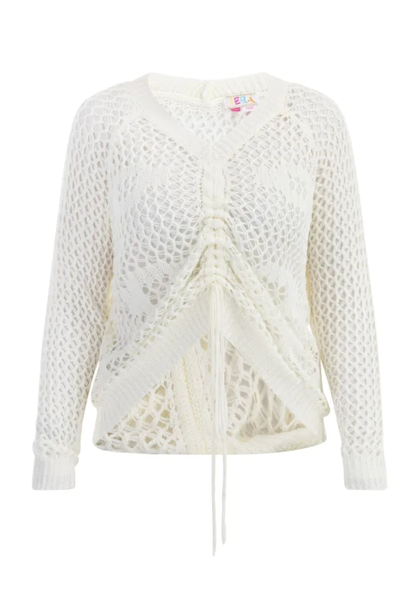 Niemand zal dit seizoen om deze trend heen kunnen: Het gehaakte breisel verovert in allerijl de catwalks. Bij IZIA is het een trui die ons verrukt met zijn gehaakte breiwerk. De luchtige steken zijn hier gebreid van een licht acrylgaren en presenteren zich in een nonchalante vorm met een V-hals. In het midden is een gebreide band verwerkt voor een stijlvol gerimpelde look. Het losse breisel doet het allemaal, zowel over een topje als over een bikini.