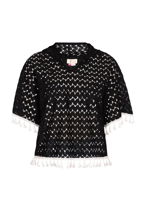 Maak kennis met een stijlvolle zomertop met geometrisch patroon voor dames, met een V-halslijn met contrasterende bies en decoratieve tapedetails langs de zoom en mouwranden. De driekwartmouwen voegen een vleugje boho-sfeer toe aan deze gebreide veelkleurige top, terwijl het golvende structuurpatroon een casual bohemien sfeer uitstraalt. Hoodie