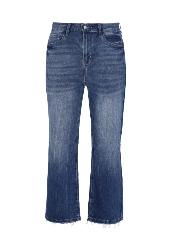 Design: 5-pocket-style; Type sluiting: Ritssluiting; Materiaal: Denim; Motief: Effen; Extra’s: Riemlussen; Wassing: Blauw denim; Lengte: 7/8 lengte; Pasvorm: Bootcut; Taillehoogte: High waist