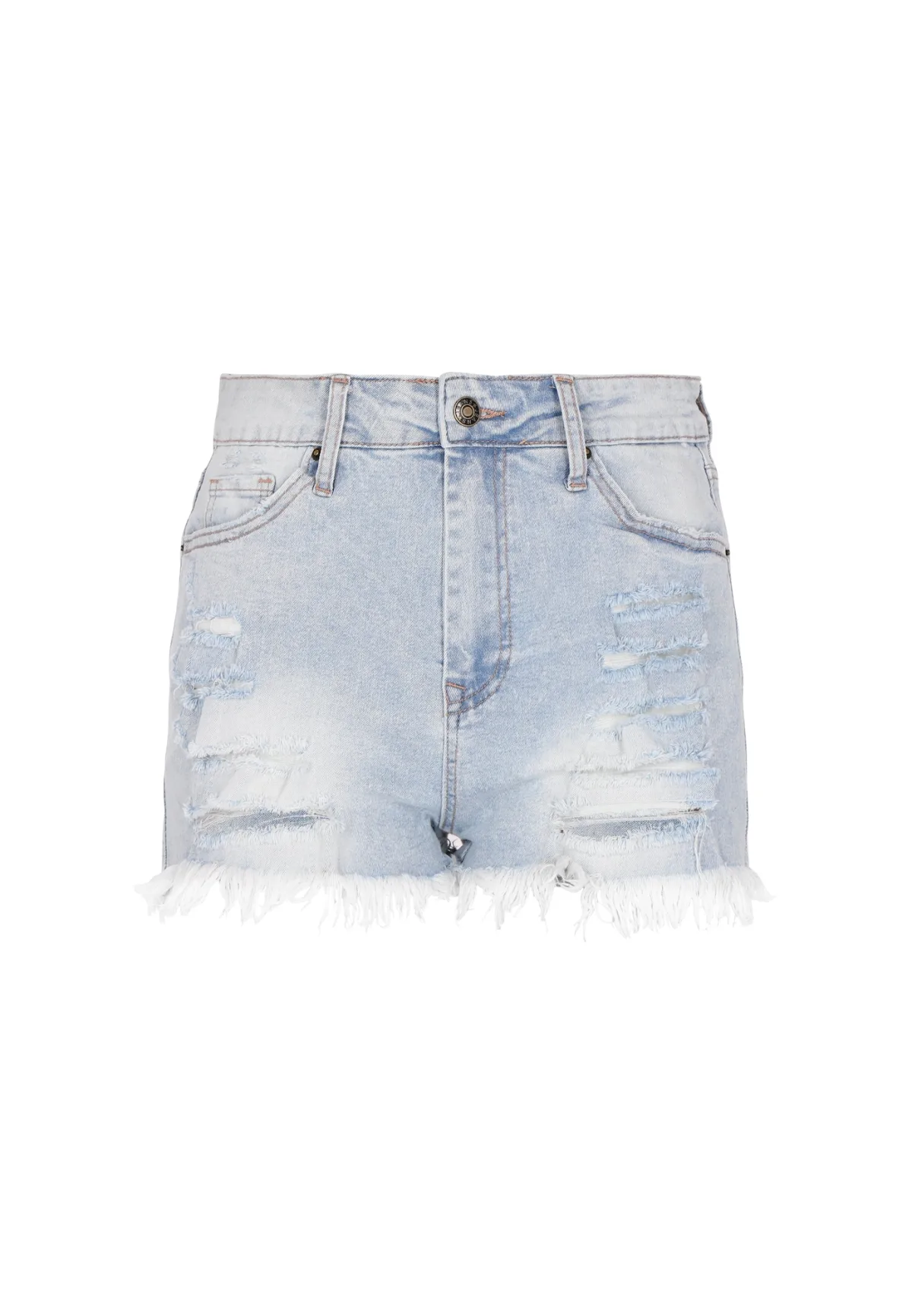 Design: 5-pocket-style; Type sluiting: Ritssluiting; Materiaal: Denim; Motief: Effen; Details: Franjes; Extra’s: Riemlussen; Wassing: ripped; Lengte: Kort/mini; Pasvorm: Regular; Taillehoogte: High waist