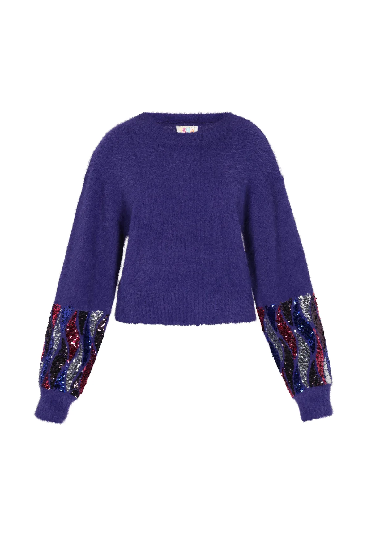 Laat u betoveren door de charme van deze korte trui, die een zachte en aangename textuur biedt en ongeëvenaard comfort belooft. De ronde hals en lange mouwen omlijsten een uniek ontwerp, met manchetten die glinsteren met pailletten of glinsterende accenten. Een relaxte pasvorm en iets losse mouwen zorgen voor een casual maar stijlvolle look - ideaal voor gezellige dagen buiten of ontspannen avonden thuis. Jumper
