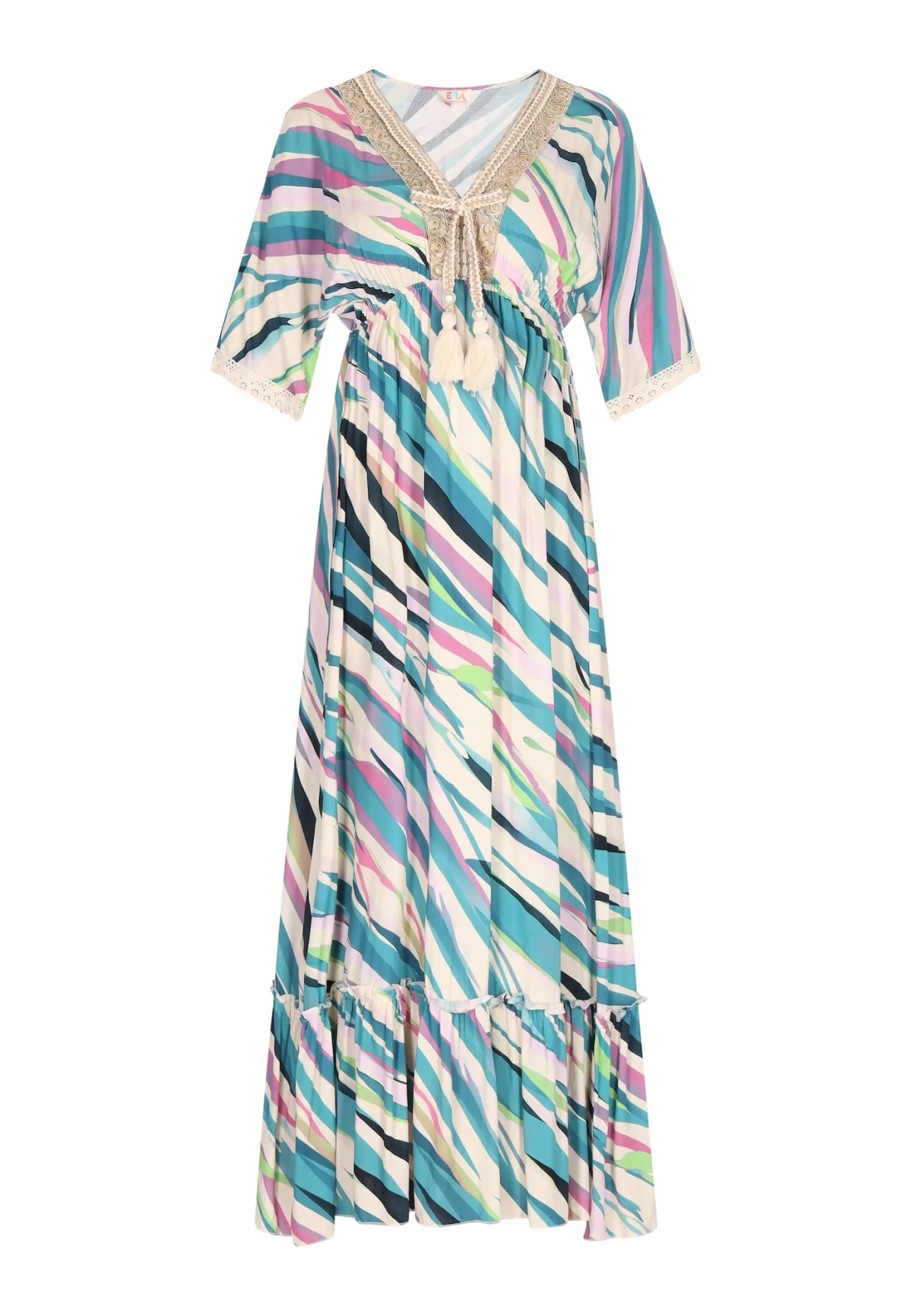 Dompel jezelf onder in de charme van deze kleurrijke maxi-jurk met zebraprint, perfect voor zomerse escapades. De V-hals is versierd met ingewikkelde borduursels en speelse kwastjes. Met korte gedrapeerde mouwen en een taille met ruches die uitmondt in een zoom met ruches straalt deze jurk elegantie uit. Het lichtgewicht materiaal is perfect voor warme dagen of in het resort en biedt comfort en stijl. Jurk