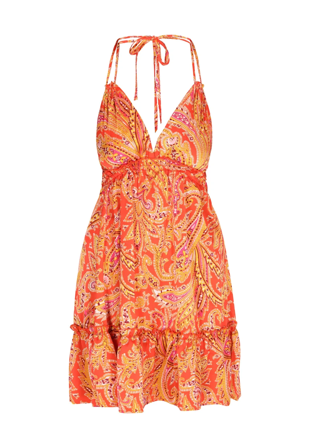Design: Om te knopen/binden; Halstype: V-hals; Motief: Paisley; Soort bandjes: Spaghettibandjes; Details: Ruches, Plooien; Extra's: All-over patroon, Voelt zacht aan; Lengte: Kort/mini; Pasvorm: Normale pasvorm; Armlengte: Mouwloos