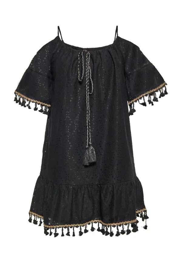 Dompel jezelf onder in zorgeloze stijl met deze boho mini-jurk. Het heeft een wijde ronde halslijn met een charmante uitsnijding en kwastjesbandjes, waardoor het een moeiteloze charme uitstraalt. Fladdermouwen en een zoom met ruches zorgen voor een luchtig silhouet, perfect voor zomerse feestjes of casual uitjes. Versierd met kant met geborduurde patronen en afgewerkt met kwastjes, is deze boho blouse een musthave voor je zomergarderobe. Jurk