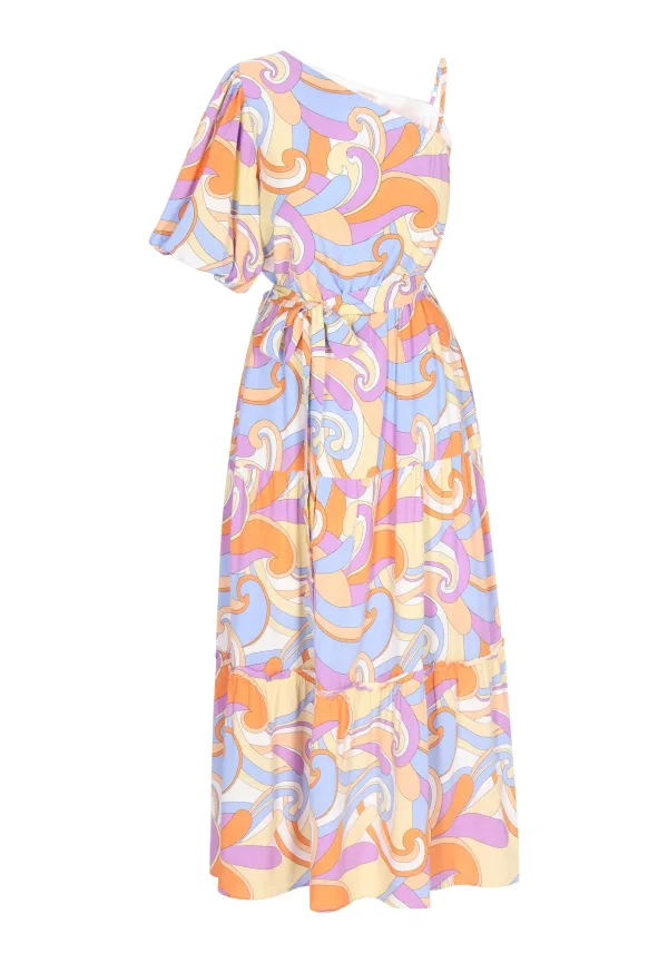 Design: Pofmouwen, Met riem; Materiaal: Viscose; Soort bandjes: One-shoulder; Details: Volant, Gedrapeerd; Extra's: All-over patroon, Voelt zacht aan; Lengte: 7/8 lengte; Snit: Uitlopend; Pasvorm: Normale pasvorm; Armlengte: Halve mouw