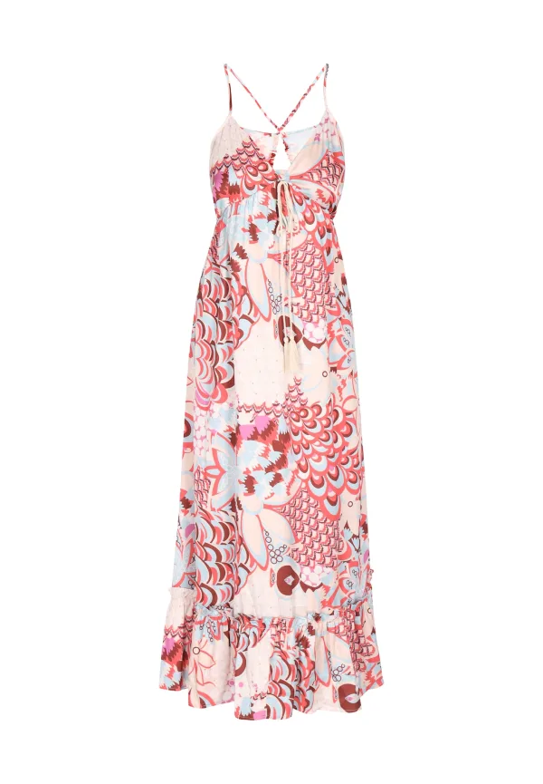 Verrijk je zomergarderobe met deze satijnen maxi-jurk met bandjes die elegantie en charme uitstraalt. Met een V-halslijn en fijne bandjes die elkaar op de rug kruisen, heeft deze strapless jurk een fladderend silhouet. Een stringdetail op het aansluitende lijfje voegt een vleugje verfijning toe, terwijl de vloeiende stof overloopt in een gegolfde zoom, waardoor een gelaagd effect ontstaat. Deze jurk met bloemenmotief is perfect voor elk feest of een speciale gelegenheid en zorgt ervoor dat je stijlvol opvalt. Jurk