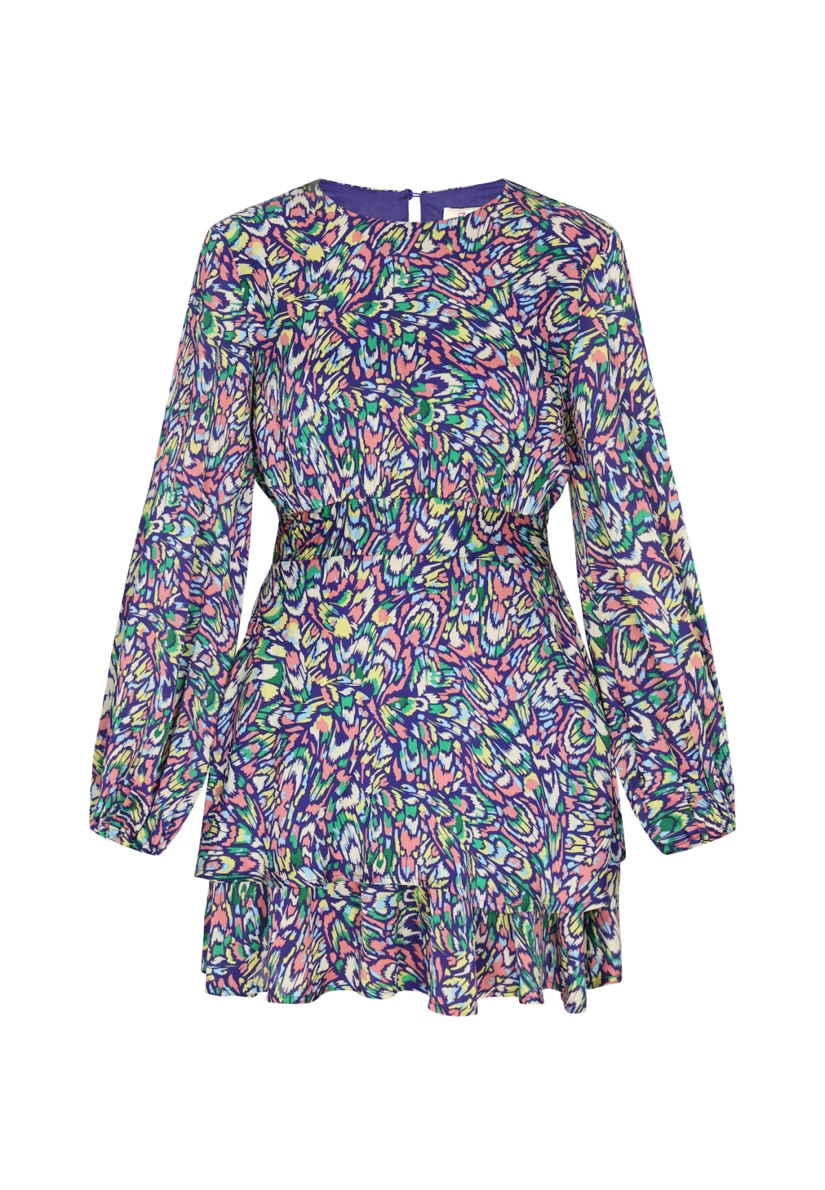 Design: Gevoerde zoom/rand, Keyholesluiting, Met riem; Type sluiting: Knoopsluiting; Materiaal: Chiffon; Halstype: Ronde hals; Details: Volant, Gedrapeerd; Extra's: All-over patroon; Lengte: Kort/mini; Snit: Getailleerd; Pasvorm: Normale pasvorm; Armlengte: Lange mouw