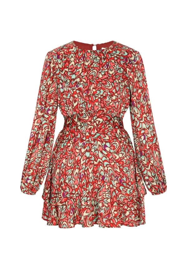 Design: Keyholesluiting; Type sluiting: Knoopsluiting; Materiaal: Chiffon; Halstype: Ronde hals; Details: Volant, Gedrapeerd; Extra's: All-over patroon; Lengte: Kort/mini; Snit: Getailleerd; Pasvorm: Normale pasvorm; Armlengte: Lange mouw