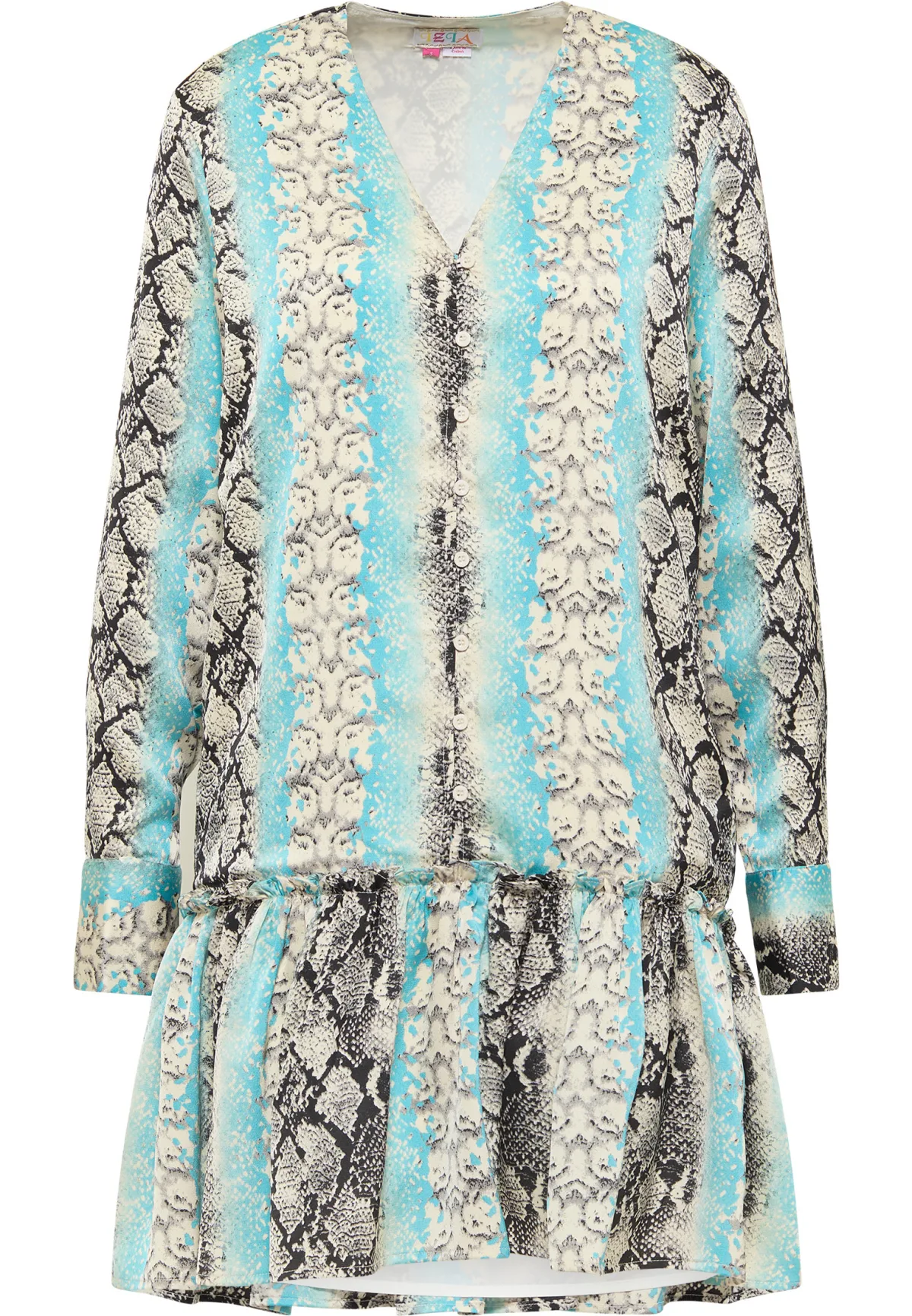 De opvallende slangenprint met contrasterende heldere kleuren maakt deze jurk van IZIA tot onze zomerfavoriet. Lange mouwen met manchetten, een diepe V-hals met knoopsluiting en de losse snit met ruches aan de zoom kenmerken de casual look. Het licht glanzende materiaal is comfortabel en ongecompliceerd om te dragen, en een binnenvoering maakt de look compleet. Cool met een bikerjack en laarzen, zomerklaar met uw favoriete sandalen.