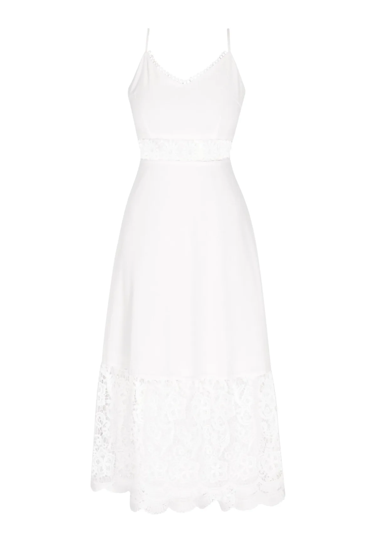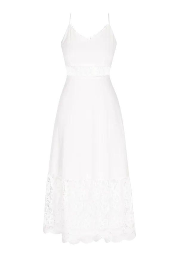 Design: Rug rits; Type sluiting: Ritssluiting; Halstype: V-hals; Motief: Effen; Soort bandjes: Spaghettibandjes; Details: Kant, Volant, Plooien; Extra’s: Op staal naden; Lengte: 3/4 lengte; Snit: Getailleerd; Pasvorm: Normale pasvorm; Armlengte: Mouwloos