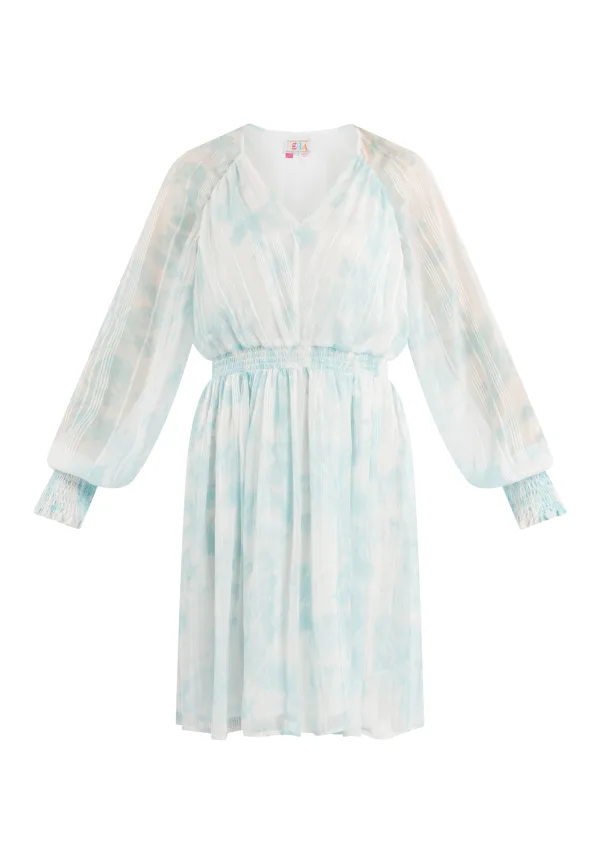 Of het nu op het strand of in het café is, de lichte batik-look, afgewisseld met goudkleurige draden, zorgt voor zomerse lichtheid. De vrouwelijke V-hals, semi-transparante mouwen, kleine ruches op de schouders en de gesmokte taille maken het sierlijke ontwerp compleet. Een binnenvoering zorgt voor ondoorzichtigheid en een modieuze uitstraling. De brede, gesmokte manchetten geven het tie-dye glittermodel zonnige vibes. Jurkje mini met lange mouwen