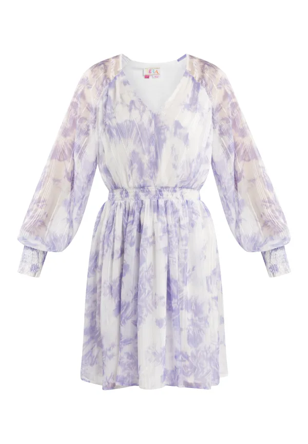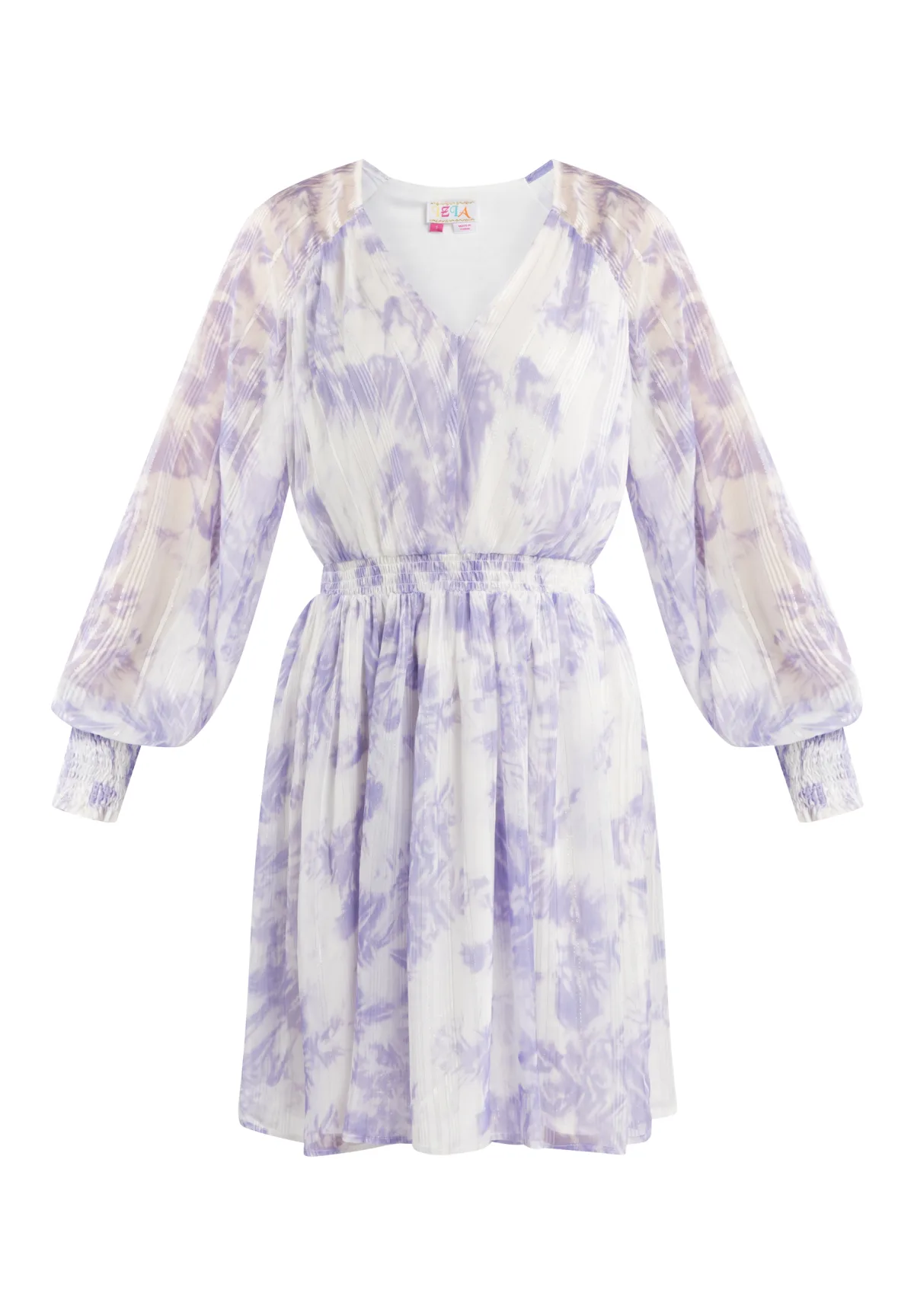 Of het nu op het strand of in het café is, de lichte batik-look, afgewisseld met goudkleurige draden, zorgt voor zomerse lichtheid. De vrouwelijke V-hals, semi-transparante mouwen, kleine ruches op de schouders en de gesmokte taille maken het sierlijke ontwerp compleet. Een binnenvoering zorgt voor ondoorzichtigheid en een modieuze uitstraling. De brede, gesmokte manchetten geven het tie-dye glittermodel zonnige vibes. Jurkje mini met lange mouwen