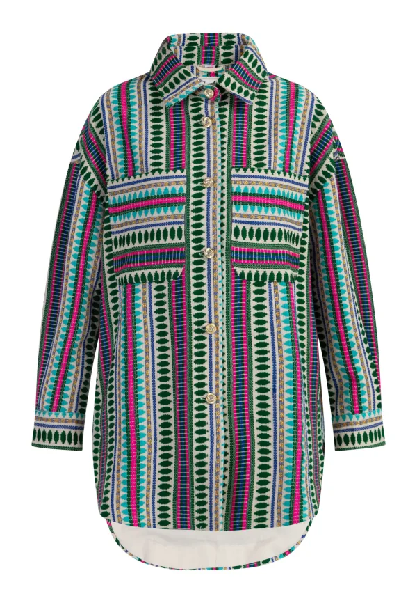 Het oversized overhemdjack van IZIA is een moderne essential die kleur aan je garderobe toevoegt. Het kleurrijke etnische design is geweven van een zachte katoenmix en afgewerkt met goudkleurige metallic garens. Klassiek heeft het een overhemdkraag, twee XL-borstzakken en een langere, afgeronde zoom aan de achterkant. Bijzonder hoogtepunt: de goudkleurige knopen zijn versierd met een fonkelende strasssteen. Overhemd jasje