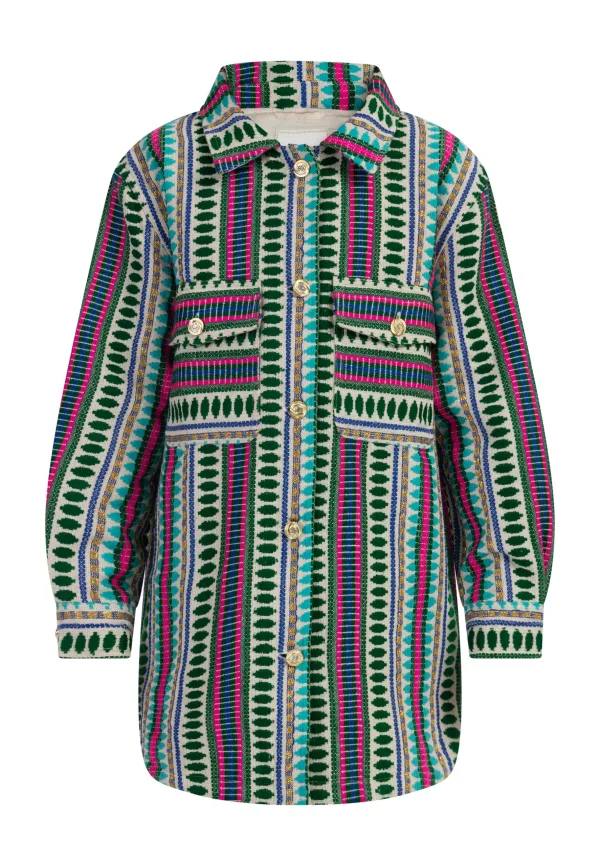 Deze oversized overhemdjasjes van IZIA zijn kleurrijk en nonchalant gesneden. De kleurrijke, geweven garens laten een fris etnisch patroon zien, wat in combinatie met denim een geweldig geheel vormt. Er zit ook een beetje sprankeling in: het goudkleurige metallic garen dat in de strepen is geweven, zorgt voor een magische glans. Maar dat is nog niet alles: uit alle goudkleurige knoopjes straalt een fonkelend strasssteentje. Overhemd jasje