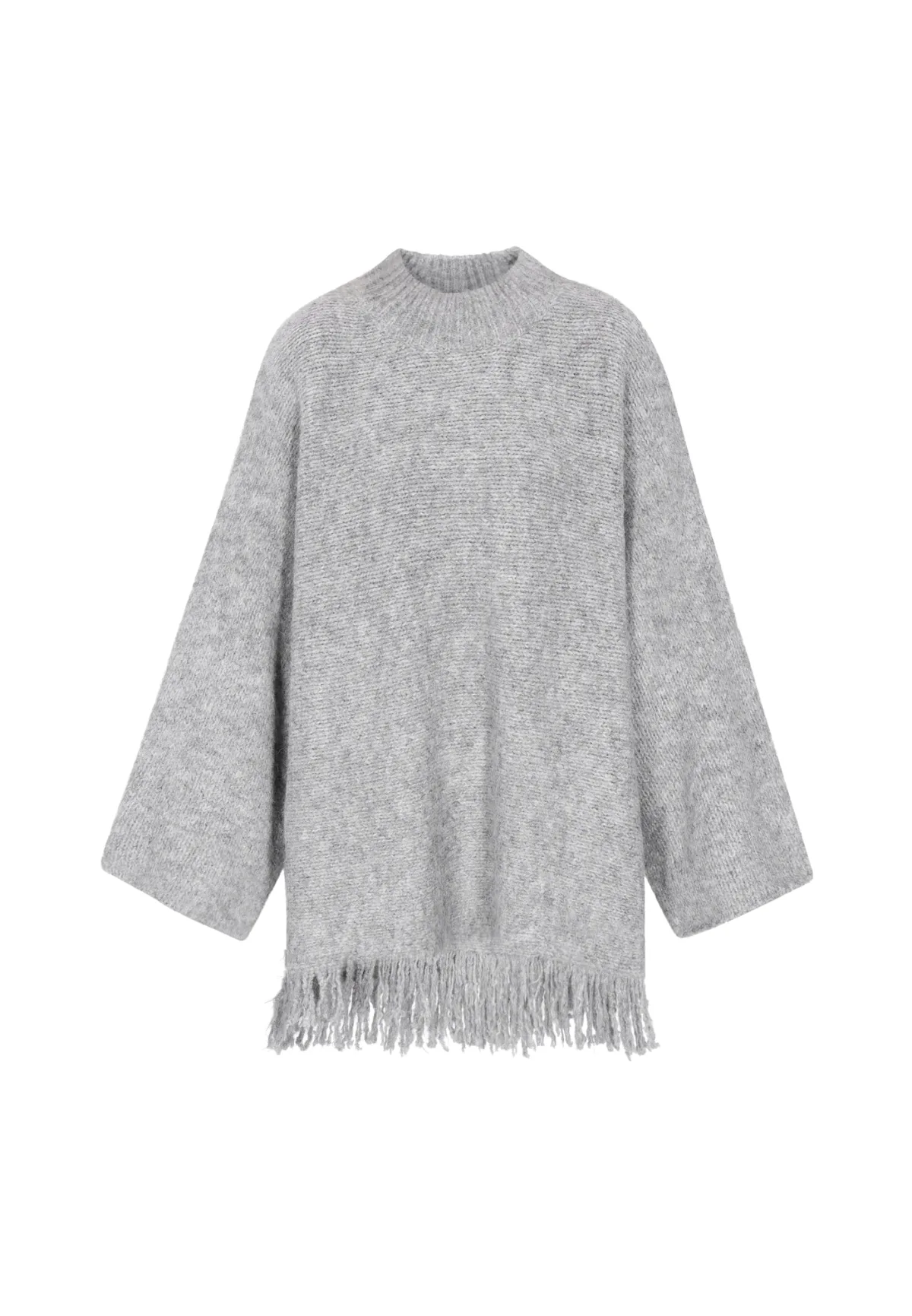Design: Extra lange mouwen, Geribd ceintuurtje; Type sluiting: Slip; Materiaal: Knitwear; Halstype: Opstaande kraag; Motief: Mélange; Details: Franjes; Extra's: Met textuur, Voelt zacht aan; Pasvorm: Wijde pasvorm; Armlengte: Lange mouw; Lengte: Lange pasvorm