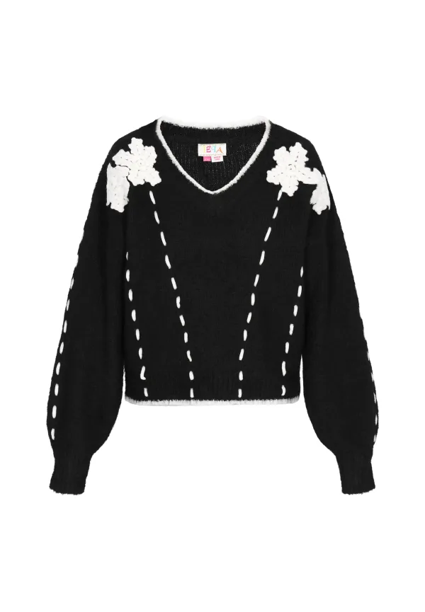 Design: Pofmouwen, Geribd ceintuurtje; Type sluiting: Slip; Materiaal: Knitwear; Halstype: V-hals; Details: Borduursels; Extra's: Applicaties; Pasvorm: Losse pasvorm; Armlengte: Lange mouw; Lengte: Normale lengte