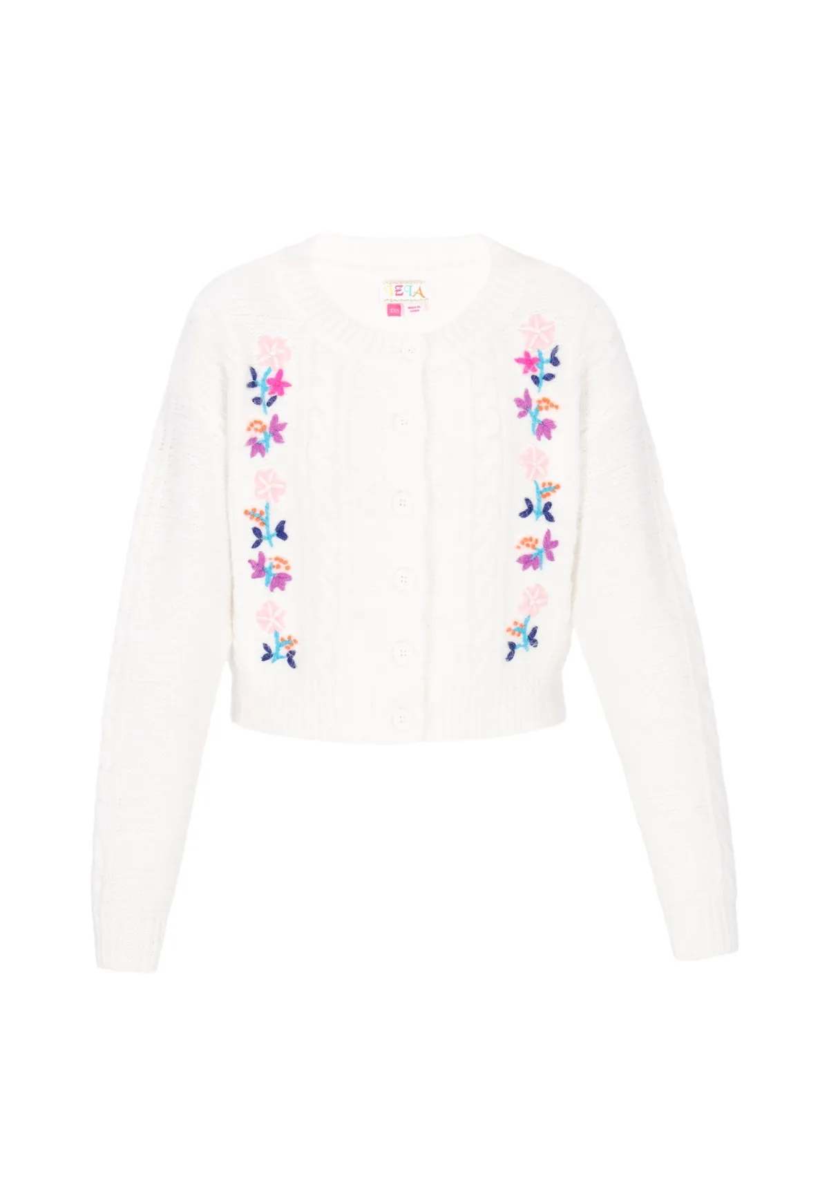 Design: Geribbelde kraag, Knop placket, Geribd ceintuurtje, Overcut schouder; Type sluiting: Knoopsluiting; Materiaal: Knitwear; Halstype: Ronde hals; Motief: Bloemenprint; Details: Borduursels; Extra's: Fully fashioned, Met textuur; Pasvorm: Losse pasvorm; Armlengte: Lange mouw; Lengte: Normale lengte