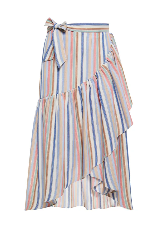 Geef je zomerlook een boost met deze kleurrijk gestreepte midi-rok met hoge taille en strikceintuur. De lange rok heeft een asymmetrische snit met uitlopende ruches, waardoor een dynamisch silhouet ontstaat dat perfect is voor casual en semi-formele gelegenheden. Deze luchtige etno-geïnspireerde rok straalt vrouwelijkheid en beweging uit. Rock