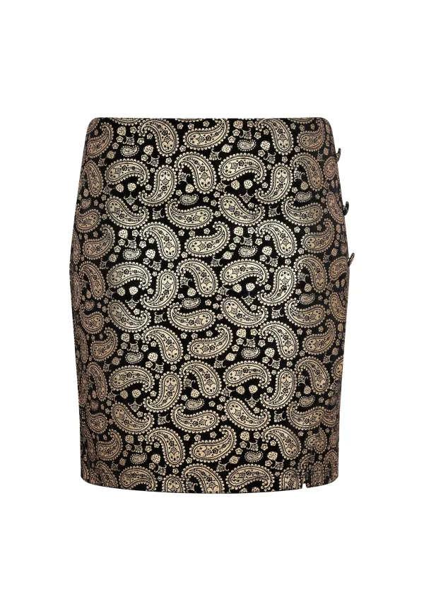 Deze rok is ontworpen met een gedetailleerd paisley-patroon, heeft een aansluitende tailleband en een rechte, losse pasvorm voor optimale bewegingsvrijheid. De lengte boven de knie wordt geaccentueerd door een zijsplit afgesloten met knoopjes. De zijdeachtige glans van de stof geeft het kledingstuk een elegante en verfijnde uitstraling. Rock