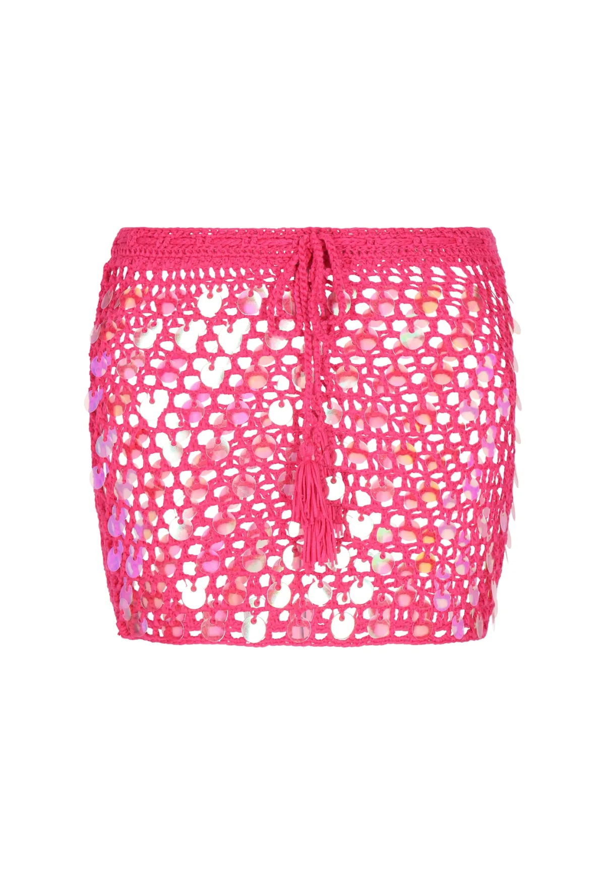 Design: Om te knopen/binden; Materiaal: Gehaakt; Motief: Effen; Rokvorm: Minirok; Details: Pailletten, Mesh; Extra's: Glitterend, All-over patroon; Lengte: Kort/mini; Pasvorm: Slanke pasvorm