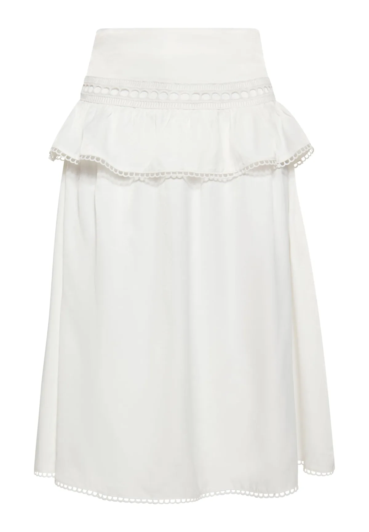 Deze midi-rok is gemaakt voor degenen die tijdloze elegantie waarderen en heeft een ontwerp met hoge taille en een platte, brede tailleband voor een aansluitende pasvorm. Fijne ruches en een decoratieve horizontale band met ronde uitsparingen zorgen voor een bijzondere charme. Het gerimpelde gedeelte zorgt voor volume en een rucheseffect, terwijl de geschulpte zoom een vleugje verfijning toevoegt. Perfect voor feestjes of zomerdagen, deze rok straalt gratie en stijl uit. Rock