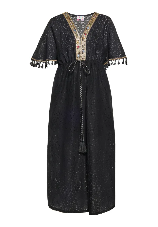 Fladdermouwen en een zoom met ruches zorgen voor een luchtig silhouet, perfect voor zomerse feestjes of casual uitjes. Versierd met kant en geborduurde patronen en afgewerkt met kwastjes, is deze boho maxi-jurk een musthave voor je zomergarderobe. Jurk