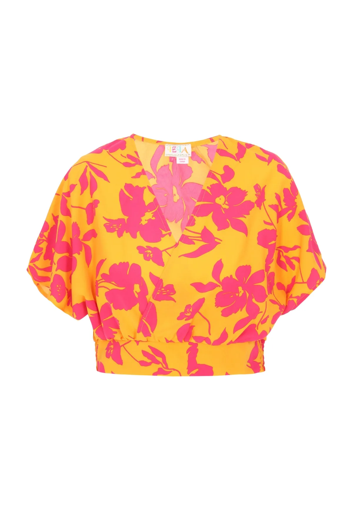 Design: Kimonomouwen, Diepe snit/decolleté; Halstype: V-hals; Motief: Bloemenprint; Details: Gedrapeerd, Wikkel design; Extra's: All-over patroon, Lichte stof; Pasvorm: Losse pasvorm; Armlengte: Kwartmouw; Lengte: Korte pasvorm