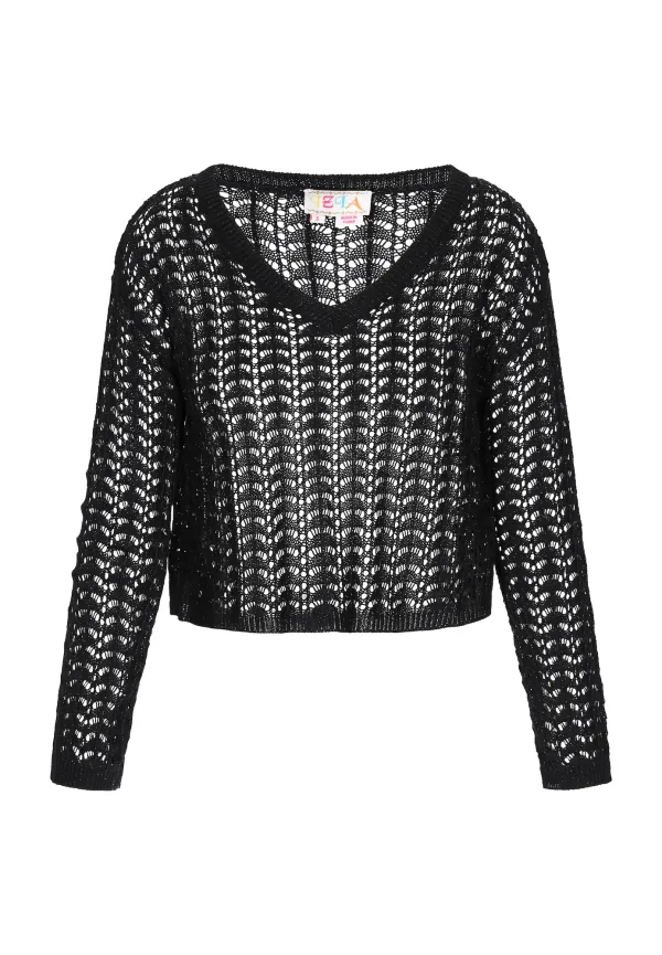 Design: Geribbelde kraag; Type sluiting: Gesloten; Materiaal: Knitwear; Halstype: V-hals; Motief: Effen; Details: Mesh; Extra's: Fully fashioned; Pasvorm: Losse pasvorm; Armlengte: Lange mouw; Lengte: Korte pasvorm