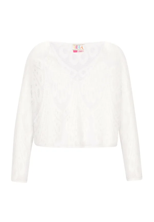 Design: Geribd ceintuurtje; Materiaal: Knitwear; Halstype: V-hals; Motief: Effen; Details: Mesh; Extra's: Licht transparant; Pasvorm: Losse pasvorm; Armlengte: Lange mouw; Lengte: Korte pasvorm