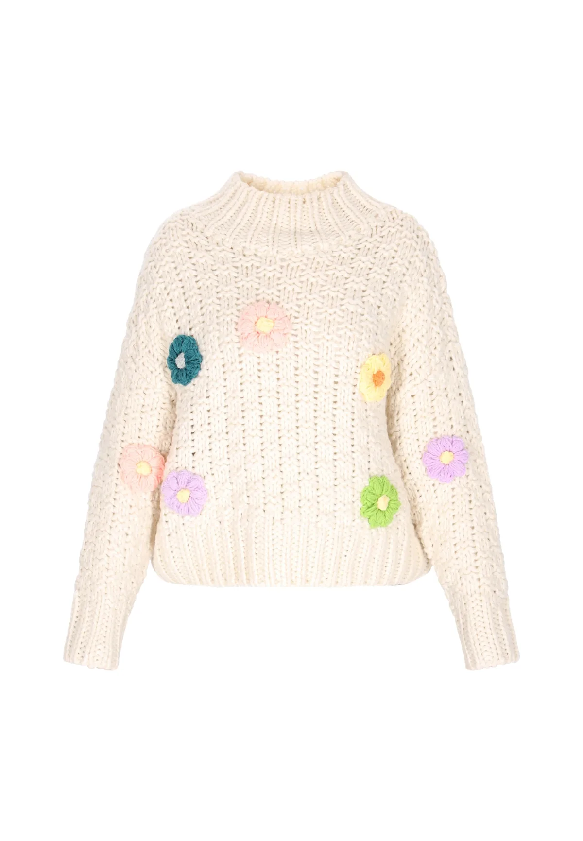Design: Geribbelde kraag, Geribd ceintuurtje; Materiaal: Knitwear; Halstype: Opstaande kraag; Motief: Bloemenprint; Details: Borduursels, Mesh; Extra's: Voelt zacht aan; Pasvorm: Losse pasvorm; Armlengte: Lange mouw; Lengte: Normale lengte