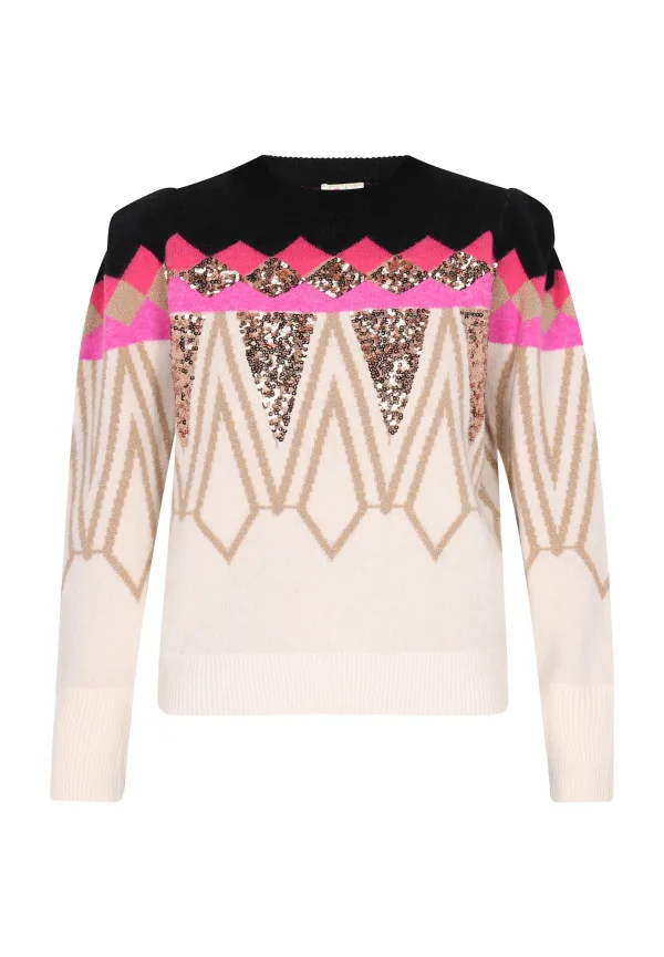 Verfijn je stijl met deze comfortabele trui met lange mouwen, ontworpen voor ultiem comfort. Met een ronde hals en een prachtig geometrisch jacquardpatroon versierd met pailletten, voegt hij een bling-bling touch toe aan elke outfit. De geribbelde manchetten en zoom zorgen voor een nauwsluitende pasvorm, waardoor dit gebreide item een ??essenti Jumper