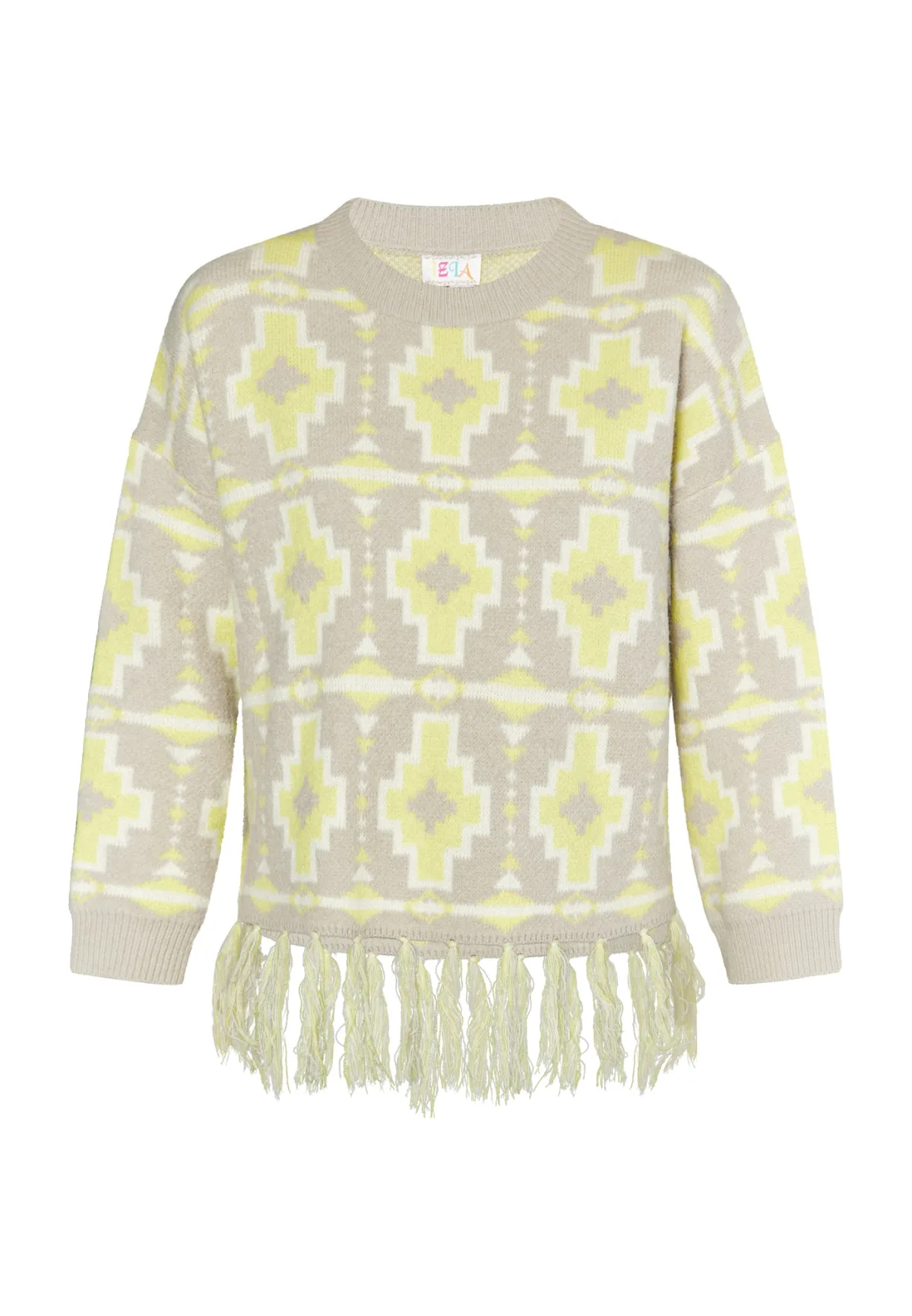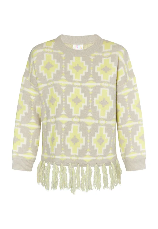 De trui van IZIA is gemaakt van een zacht garen en heeft een losse pasvorm. Dankzij het opvallende etnische patroon en de franjes aan de zoom wordt de trui snel een trendstuk van het winterseizoen. Het ontwerp wordt compleet gemaakt door de laatste geribde manchetten. Jumper