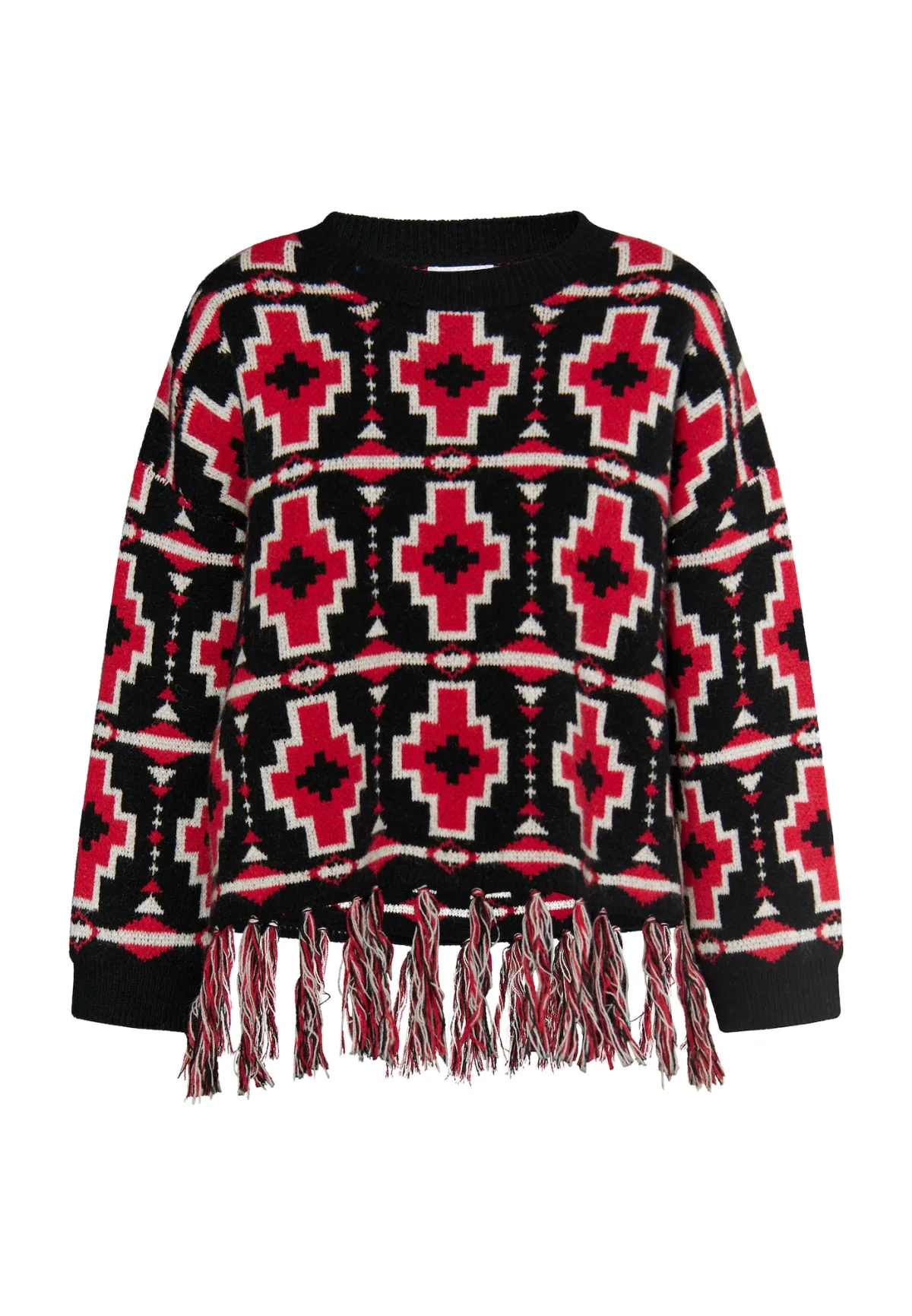 De trui van IZIA is gemaakt van een zacht garen en heeft een losse pasvorm. Dankzij het opvallende etnische patroon en de franjes aan de zoom wordt de trui snel een trendstuk van het winterseizoen. Het ontwerp wordt compleet gemaakt door de laatste geribde manchetten. Jumper