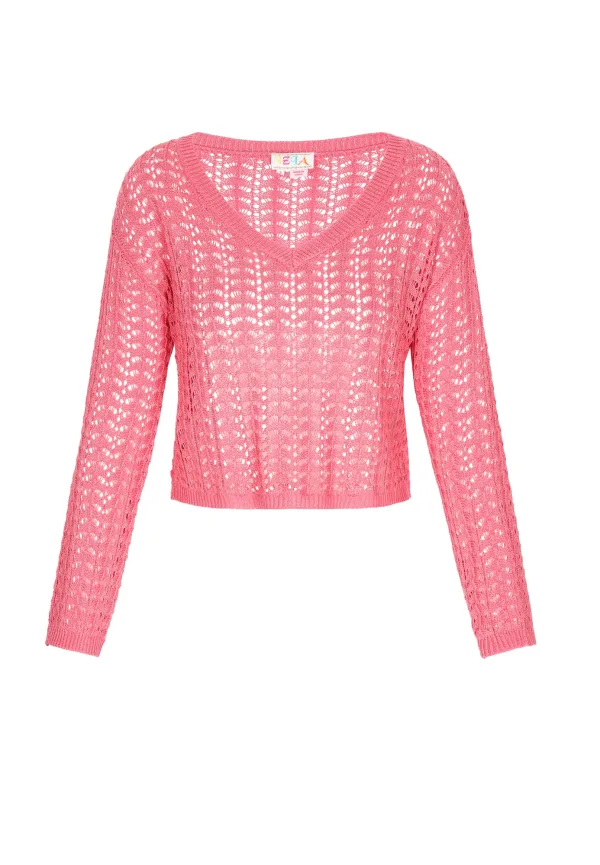 Design: Rechte zoom; Type sluiting: Gesloten; Materiaal: Knitwear; Halstype: V-hals; Motief: Effen; Details: Mesh; Extra’s: Voelt zacht aan; Pasvorm: Losse pasvorm; Armlengte: Lange mouw; Lengte: Korte pasvorm