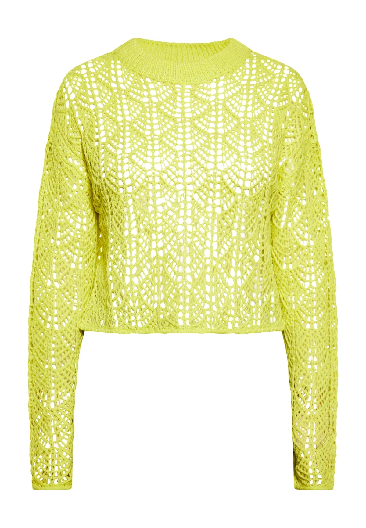 Deze met precisie vervaardigde opengewerkte trui heeft een kortere snit en een patroonontwerp dat elegantie uitstraalt. De lange mouwen reiken tot aan de pols, terwijl de geribde kraag, zoom en manchetten een goede pasvorm bieden. Het kantachtige effect van het opengewerkte breisel geeft een luchtige touch aan het regular fit silhouet. Gebreide trui