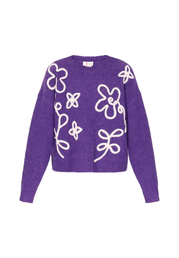 Design: Geribd ceintuurtje, Overcut schouder; Type sluiting: Slip; Materiaal: Knitwear; Halstype: Ronde hals; Motief: Bloemenprint; Details: Borduursels; Extra's: Op staal naden; Pasvorm: Losse pasvorm; Armlengte: Lange mouw; Lengte: Normale lengte