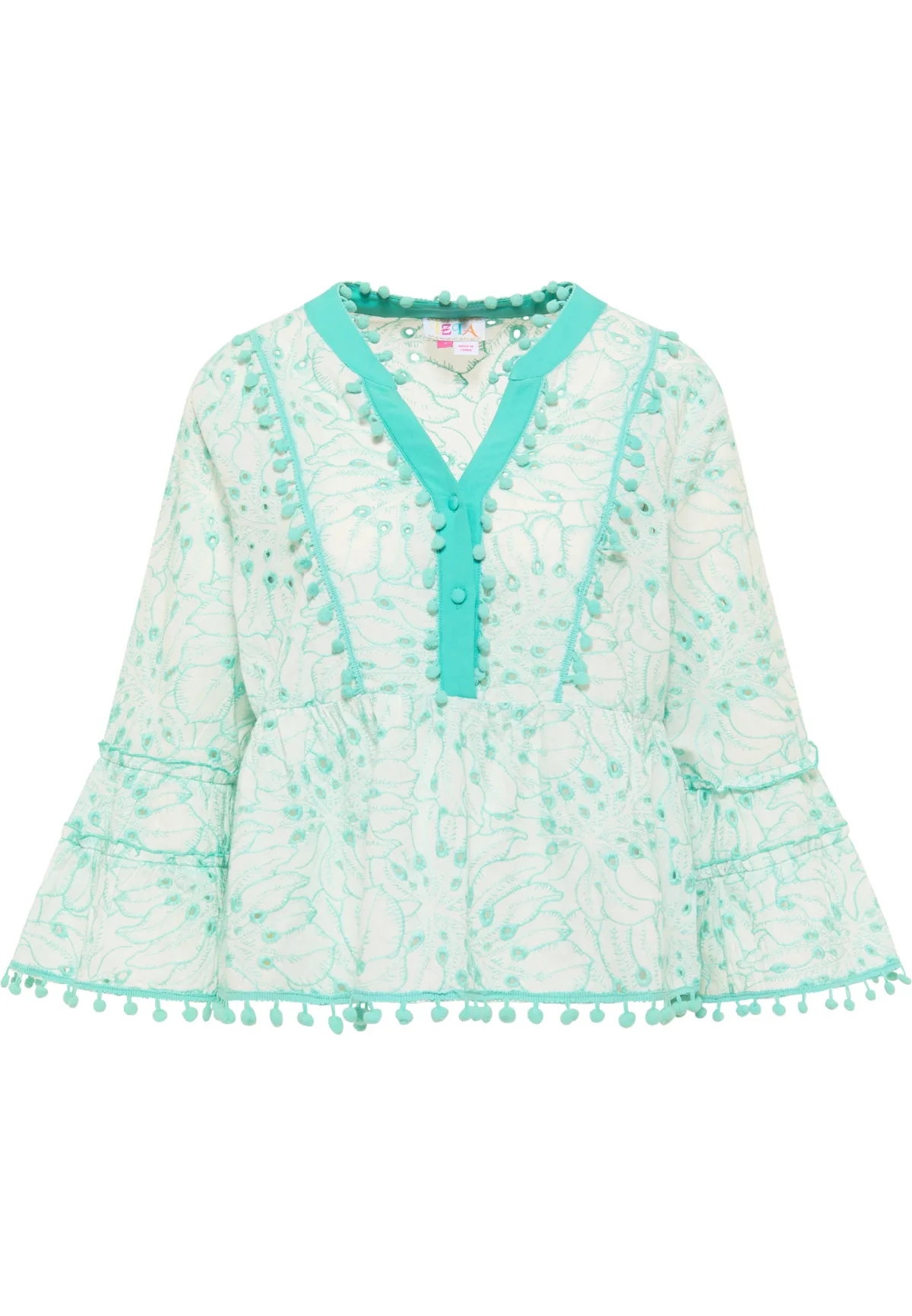 Een vleugje hippie gecombineerd met een snufje boho maken de tuniekblouse van IZIA tot een zomerse droom. Het ingewikkelde ontwerp met borduurwerk, pompons en geperforeerd kant is gewoon om verliefd op te worden en maakt van deze blouse iets heel bijzonders. De diepe V-hals en de gaten in het borduurwerk laten een beetje huid zien, terwijl de losse pasvorm met volant een chill-out gevoel creëert. Met deze blouse kun je gemakkelijk de zonsondergang tegemoet dansen.